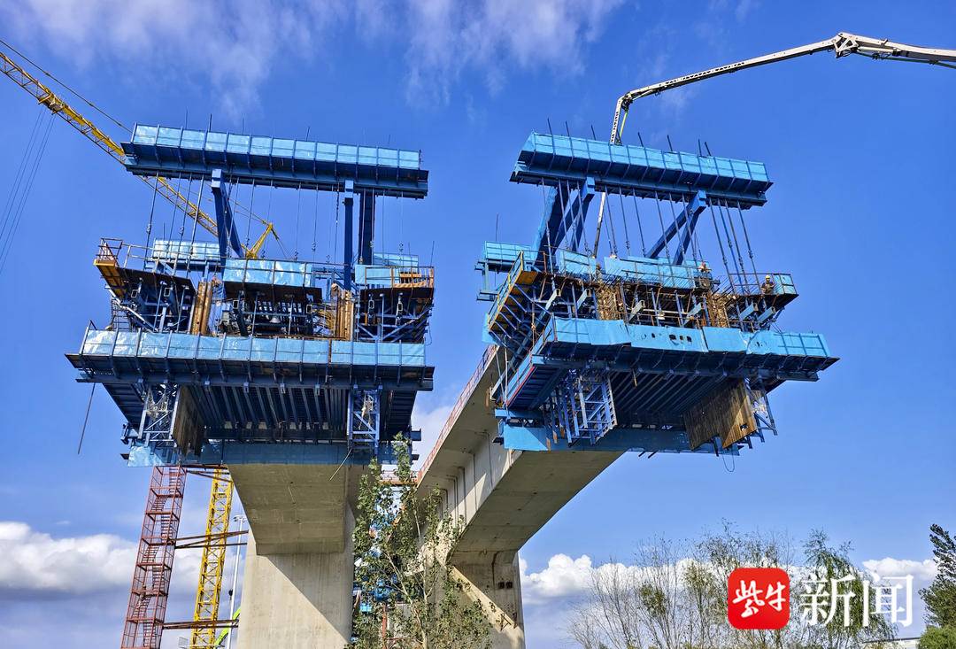 崇启公铁长江大桥南引桥位于江苏省启东市启隆镇境内,表层是高速公路,基层为高铁线、城际线,其中高铁线、城际线长均为830.05米,19个桥墩,区分有跨长岛通衢和跨南汊河两个接续梁。这次浇筑的是跨南汊河刚构接续梁南T构第8个节段,该接续梁共11个悬浇段,除1号块节段长度3.5米,2号块、3号块节段长度4米外,其余节段长度均为5米,跨南汊河总长256米,一齐聘任挂篮法施工。展望本年12月跨南汊河接续梁城际线施工一齐完成。